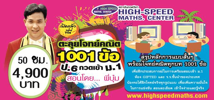 HIGH-SPEED MATHS.CENTER เปิดคอร์สตะลุยโจทย์ คณิตป.6 เข้า ม.1 จำนวน 1001 ข้อ โดยรวบรวมโจทย์จริงแข่งขันจาก โรงเรียนชั้นนำทั่วประทศในการสอบเข้า ม.1 ทั้งห้อง GIFTED และห้องธรรมดา เช่น โรงเรียนสวนกุหลาบ โรงเรียนสตรีวิทยา โรงเรียนบดินทรเดชา โรงเรียนหอวัง โรงเรียนหาดใหญ่วิทยาลัย และ โรงเรียนชั้นนำทั่วประเทศ กว่า 1001 ข้อ เพื่อให้น้องๆได้ฝึกโจทย์ คณิตศาสตร์ที่ใช้ในการสอบจริง เพื่อให้น้องๆเพิ่มความมั่นใจ ในการลงสนามสอบ อย่างมั่นใจ เพราะแนวข้อสอบไม่ว่าโรงเรียนไหนๆ ก็จะมีความคล้ายกันมากมาก โดยได้รวบรวมโจทย์ทุกรูปแบบ ทุกเรื่อง สอนอย่างเป็นระบบ ละเอียด รู้จริง สอนทุกข้อ ไม่ข้ามโจทย์ ด้วยชั่วโมงเรียนกว่า 50 ชั่วโมง ค่าเรียน 4900 บาท และที่สำคัญสอนโดยพี่บุ๋ม ผู้ที่มีประสบการณ์สอนคณิตศาสตร์ มากกว่า 20 ปี สอนสนุก เข้าใจง่าย รับรองว่าน้องจะพึงพอใจในคะแนนในส่วนนี้อย่างแน่นอน เพราะเราเอาข้อสอบ ตัวจริงมาวิเคราะห์ พี่บุ๋มยังเป็นวิทยากรรับเชิญจากโรงเรียนชั้นนำมากกว่า 200 โรงเรียนทั่วประเทศ และเป็นผู้สอนนักเรียนสอบได้ที่ 1 ประเทศไทย และโอลิมปิกปีล่าสุด และเป็นผู้ได้รับการ VOTE ให้ออกข้อสอบคณิตศาสตร์ ONET+PAT1 ปีล่าสุดผู้เข้าสอบมากกว่า 200,000 คนทั่วประเทศ จองด่วนก่อนเต็ม เรียนจากระบบ ON DEMAND เรียนซ้ำกี่รอบก็ได้